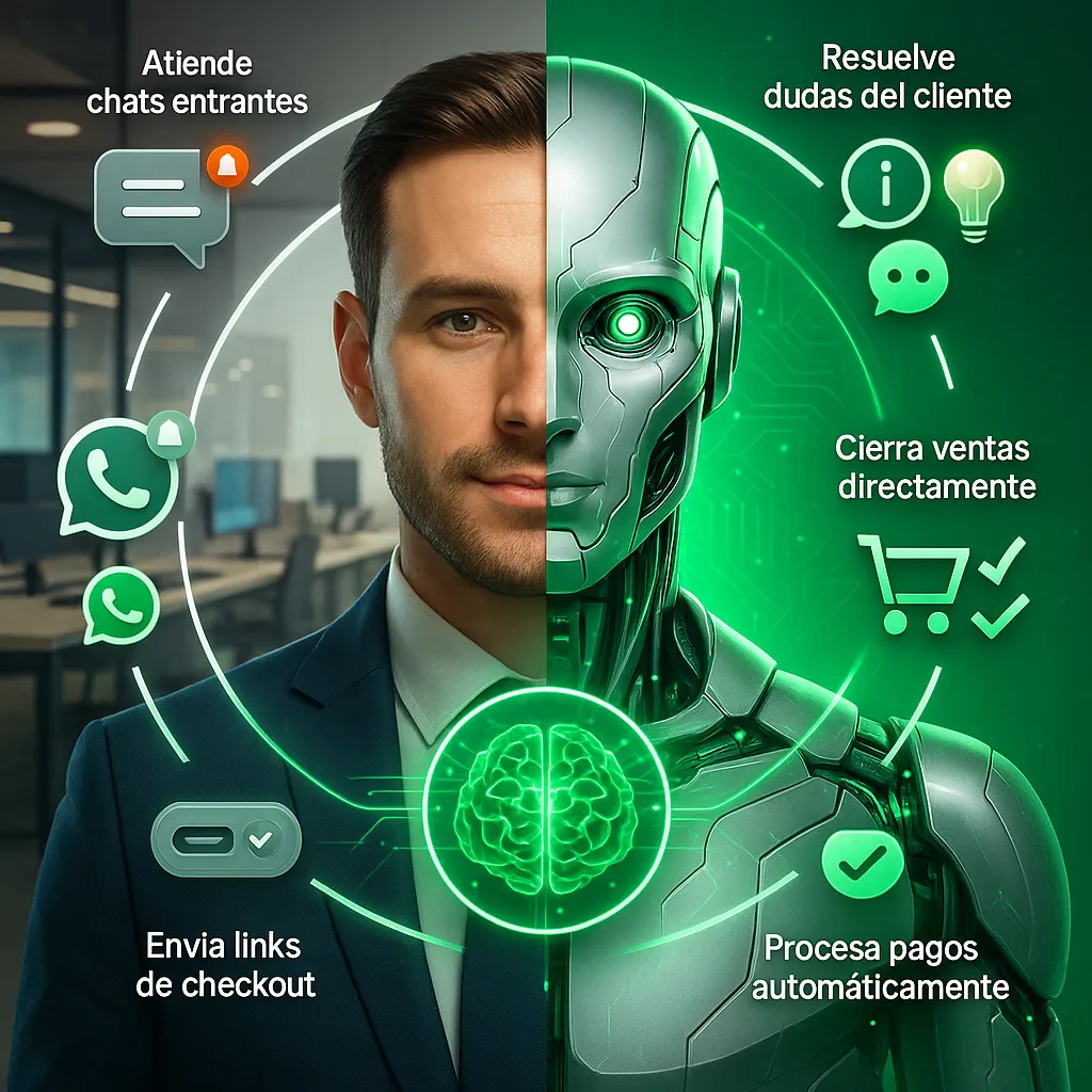 Atiende chats entrantes de WhatsApp (o integraciones web), resuelve dudas y cierra ventas directamente, incluso procesando pagos o enviando links de checkout.